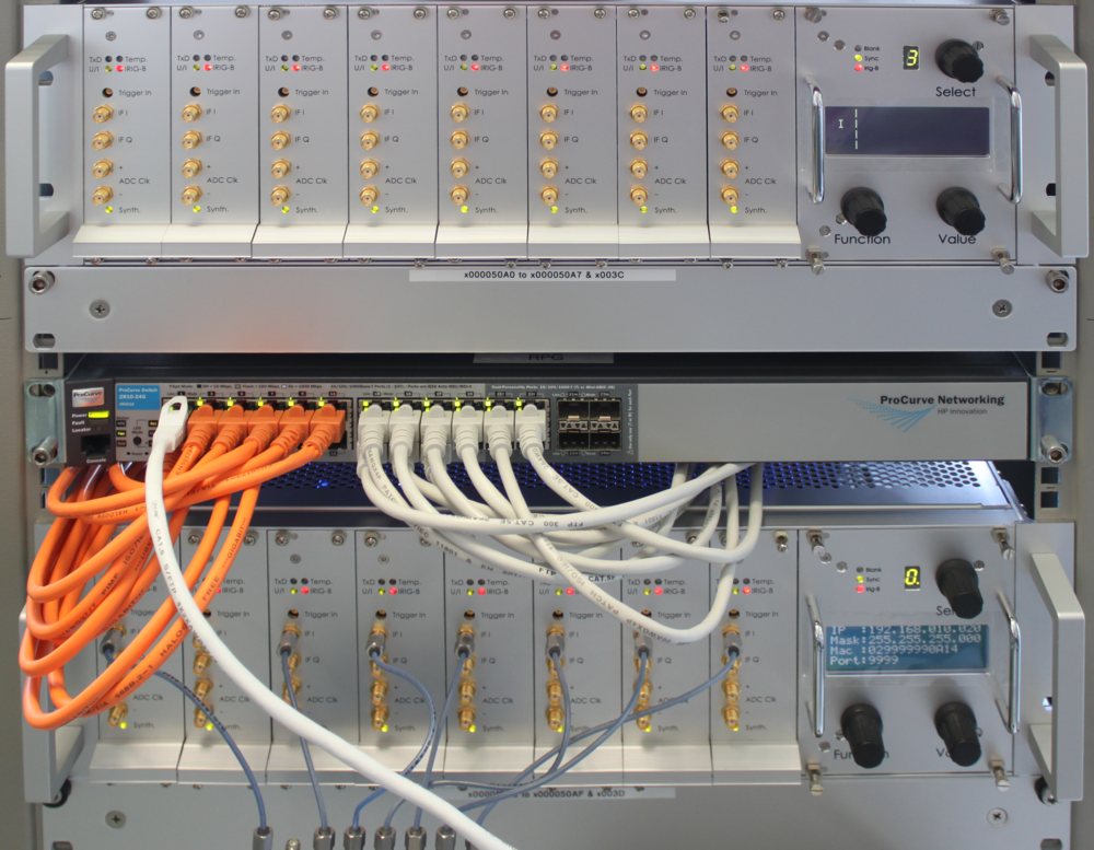 | The XFFTS-boards include a standard 100 MBit/s Ethernet interface, which simplifies the combination of many boards into an Array-XFFTS, simply by integration of a common buffered Ethernet switch. Up to eight XFFTS-boards can be housed in one XFFTS-crate together with power supplies (4 × 5 Volt / 20 Amperes) and one XFFTS-controller. The XFFTS-controller manages the synchronization of the XFFTS-boards. It provides a reference clock for the on-board ADC synthesizers or the GPS/IRIG-B timing information. In addition, the XFFTS-controller displays housekeeping information on a four line LCD, like board IP numbers, temperatures of the ADC and FPGA chips as well as the power level of the IF inputs. |